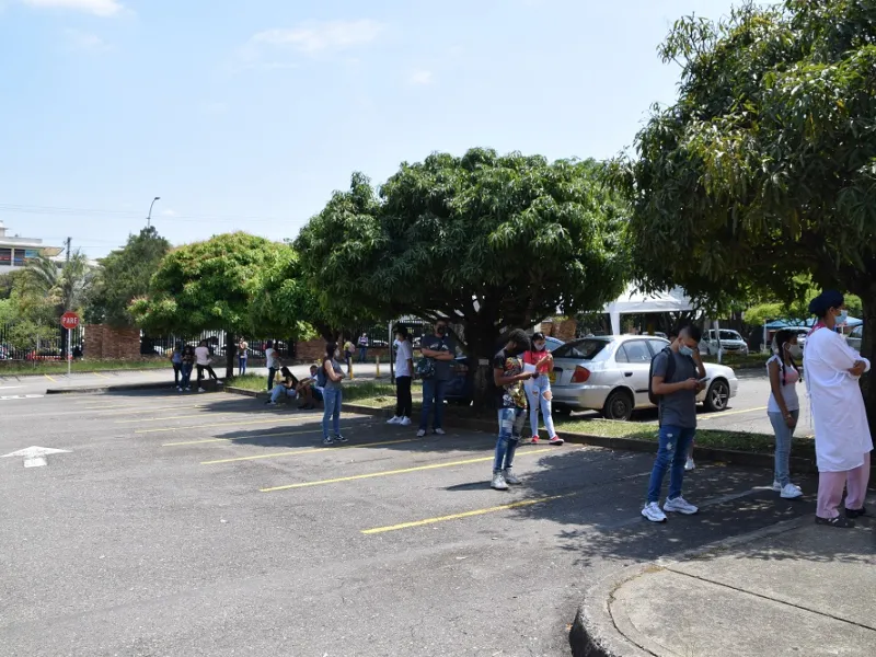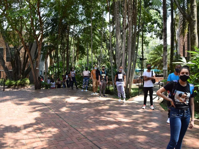Desde las 6:00 a.m. los estudiantes realizaron la fila afuera de la universidad y uno a uno fueron ingresando al campus para cumplir con los protocolos. Para las pruebas se habilitaron los edificios de El Samán y El Lago, los cuales contaron con la presencia de los biogestores que se encargaron de brindar apoyo logístico.